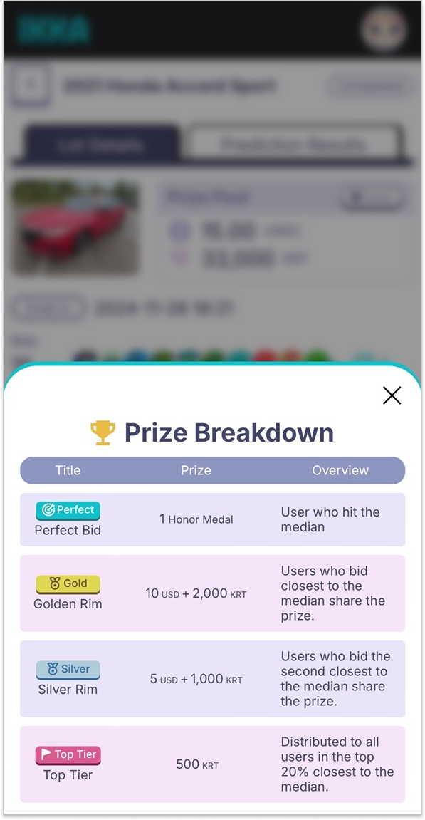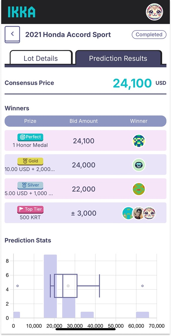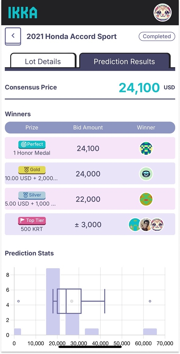 In IKKA, cars with unknown prices are listed. Use your intuition or research similar cars on used car websites to estimate the price of a listed car. Once you’ve decided on what you believe to be the correct price, pay the specified amount of KARAT (our in-game token) to place your bid.