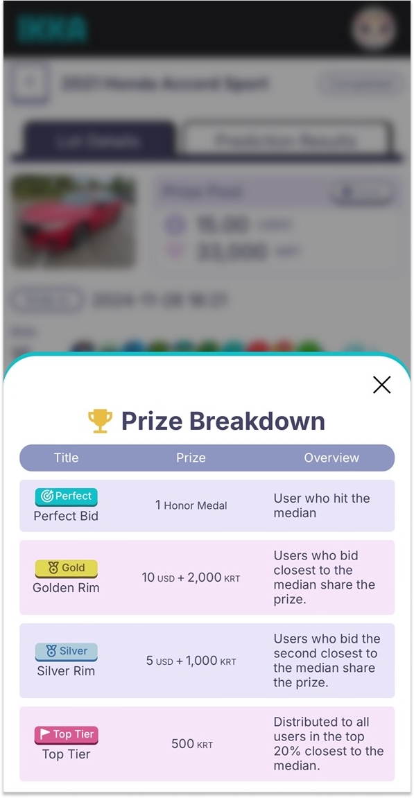Each bidding session has a set duration, and once the bidding period ends, results are automatically calculated. Those who propose the most accurate price will receive prizes.