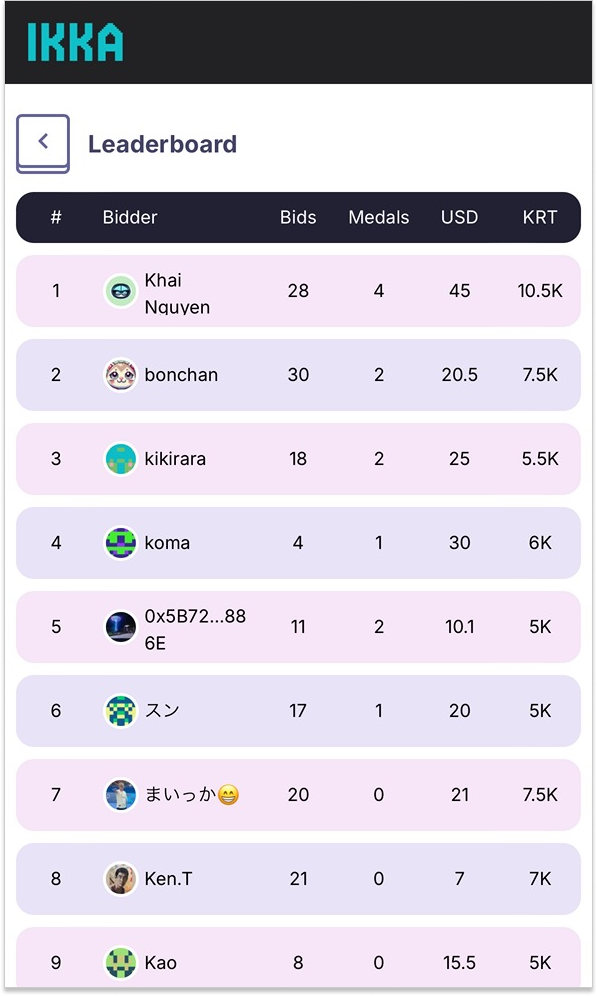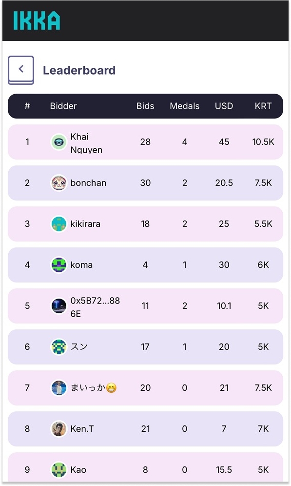 A ranking is automatically generated based on the number of bids, the number of wins, and the total prize amount earned, and the leaderboard displays the positions. The rankings are calculated and updated four times a day, based on the performance from the past three months. (In other words, data older than three months is excluded from the rankings.)